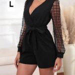 Enterizo corto de mangas largas transparentes, atado en la cintura y escote en V
