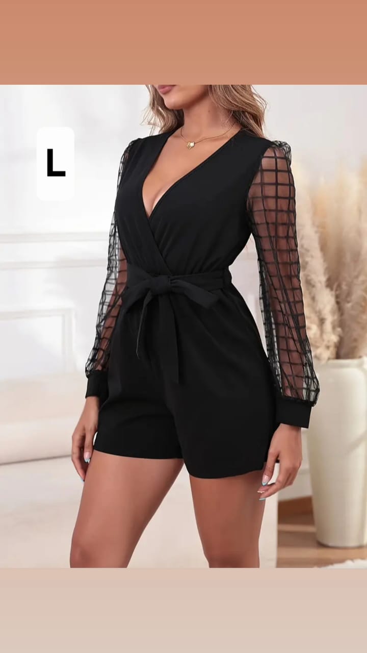 Enterizo corto de mangas largas transparentes, atado en la cintura y escote en V