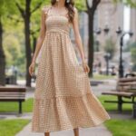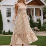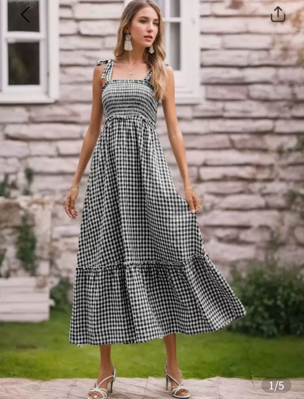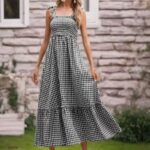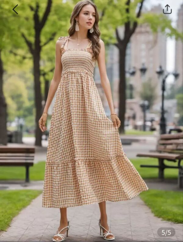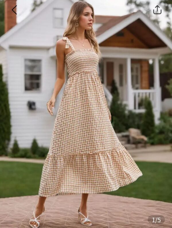 Vestido con tirantes atados y con falda acampanada, diseño de cuadros