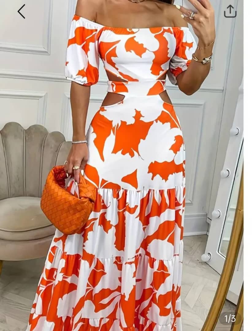 / Vestido largo de mangas corta aglobadas y aberturas sobre las caderas