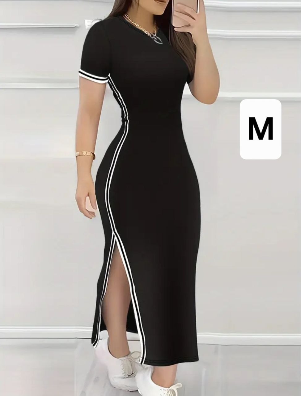 • Vestido largo y ceñido de mangas cortas, con abertura a media pierna.