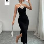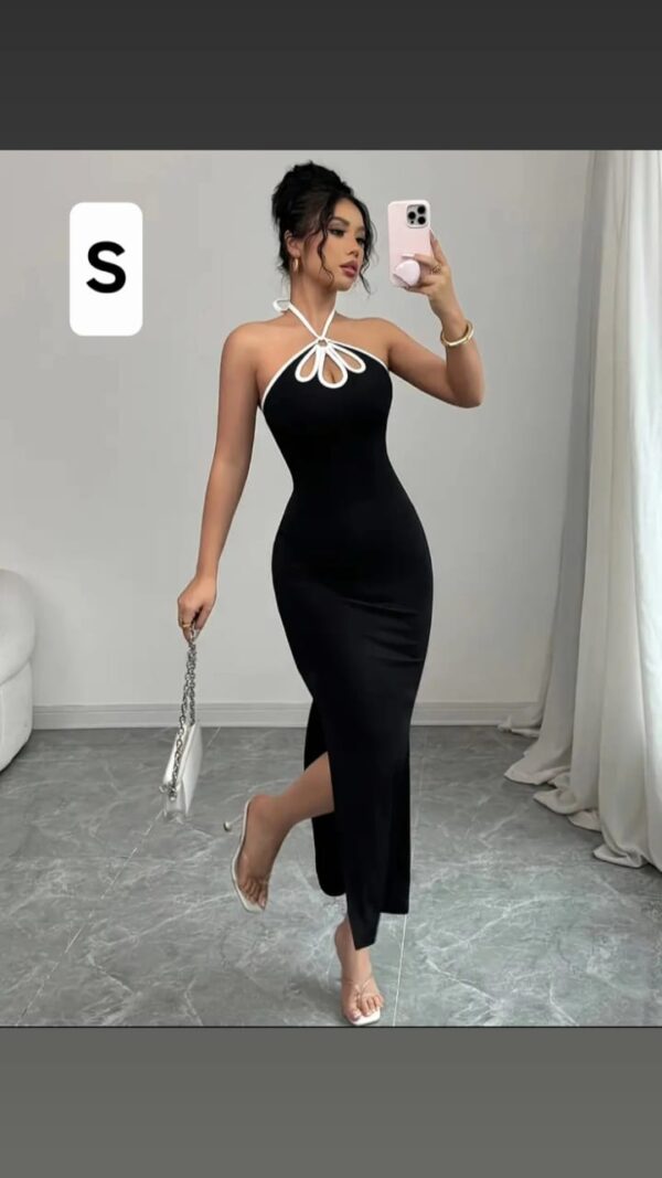 Vestido largo y ceñido, atado al cuello y abertura lateral